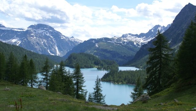 Devero (Crampiolo) – Binn Gleich nach dem Start kommen wir zum Lago Devero. Ein tiefblauer See umrahmt von Lärchen, inmitten herrlicher Bergwelt. Bei dem Anblick wird selbst Kanada neidisch. Über den Albrunpass, ein historischer Übergang auf gutem Saumpfad, kommen wir ins Binntal. |